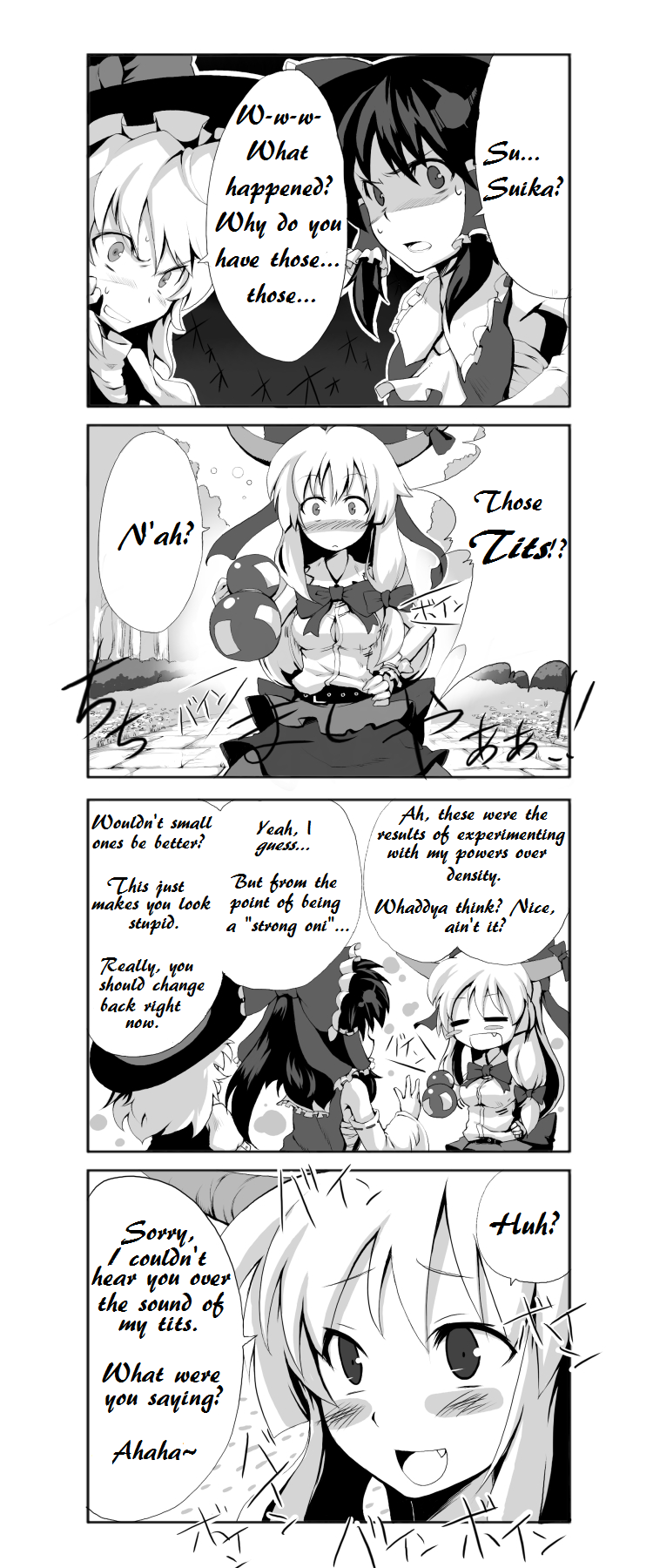 wasn't thinking about it until you brought it up. "Now that you've brought it up, that has crossed my mind every now and again. I've just been good at shoving such things off to the side in favor of more productive things." ...What I said to Aya, Marisa, and Eirin earlier is true. I've never even seen a woman's undergarments, let alone what those articles of clothing cover up. Such things simply didn't concern me, nor did they draw my curiosity in far enough before now.