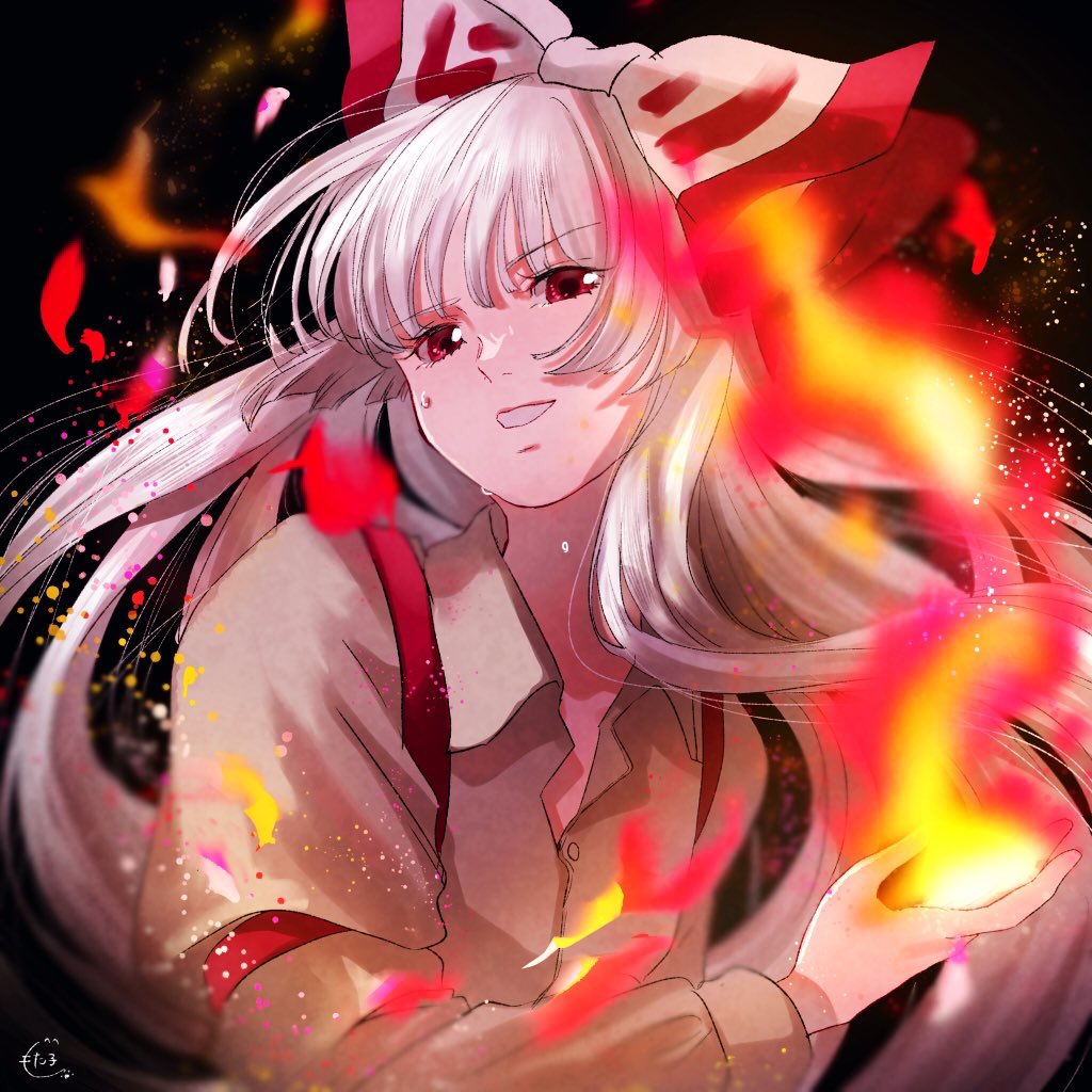 Mokou catches Kaguya's burnt torso in the air and flies higher, "Whew, I saw your danmaku just in time, Princess!" She says it with a chippy smile.