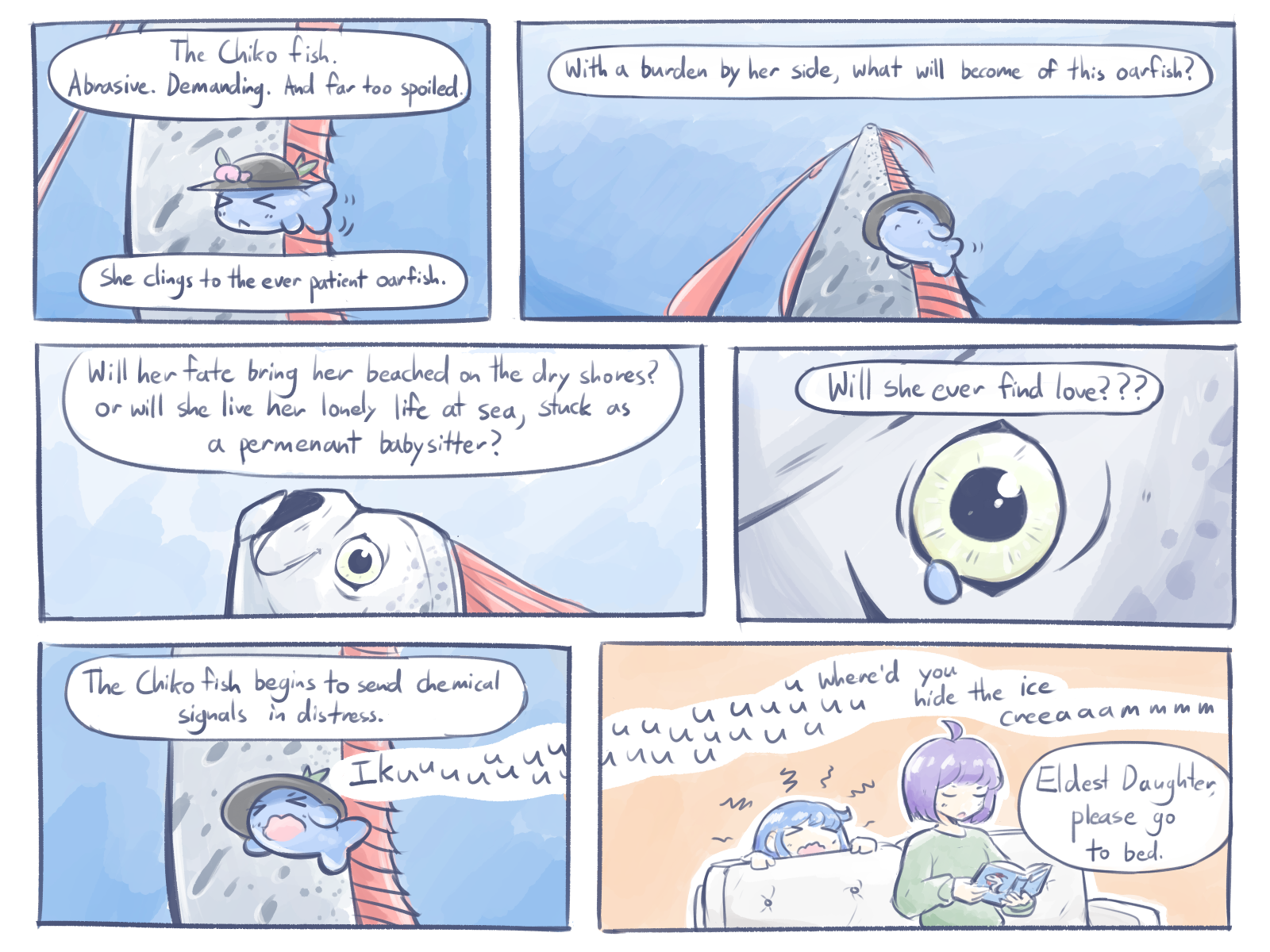 Anyways, uh, the Touhou character. I have to admit that they're not the most inspiring to me personally. I suppose you could have her be some kind of 'hell employment/immigration manager', where she 'drags' people/yokai/gods/whatever to hell by promising them employment there? or you could have her be some kind of recurring, terminator type antagonist that keeps coming back. That'd be funny, I think.