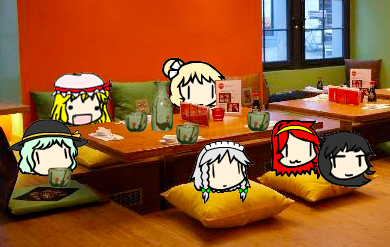 Koishi returns with another pitcher, the liquid taunting you with its being-there-ness. No more fooling, though; you need to play to stay sober. Well… okay, you’ll admit it, you’re drunk. Play to stay more sober than Sakuya, then; she’s laughing at everything by now, even things that Tullia is saying, and come on, she’s Tullia. Wendy is funnier than Tullia for crying out loud. Seriously, like, how can Tulia possibly be a fairy when she’s so boring? You know she’s old, but come on, lighten up, girl! You offer her some beer for like the tenth time today, which she again declines, despite you even offering to pour it for—oh, crap, you spilled it again. Sorry; those aren’t your good shoes, right?