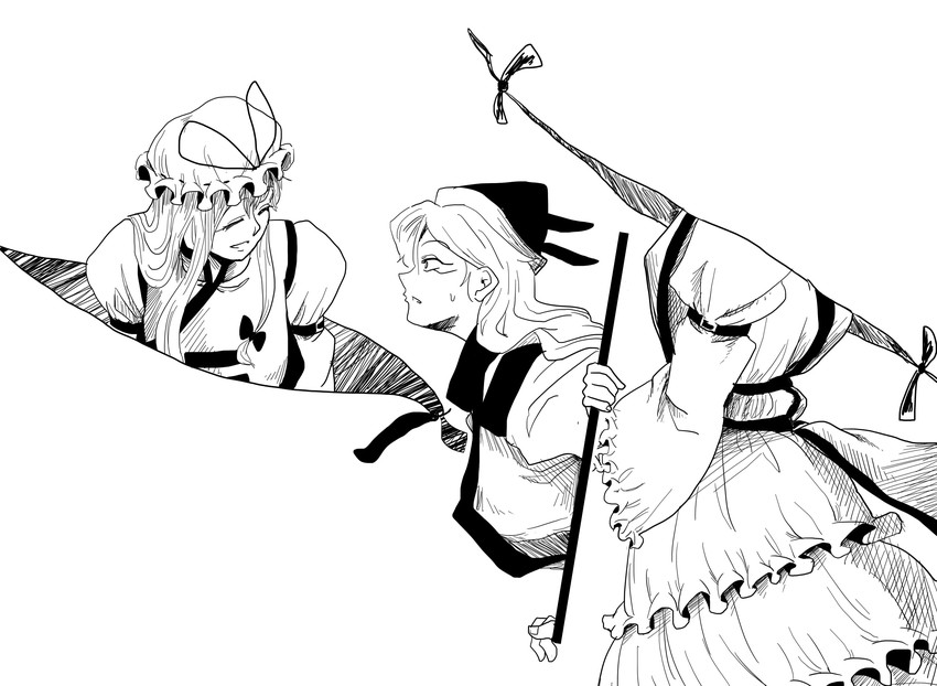Ran bumps my shoulder, looking out into the distance without apparent reason. I cease my quibbling and follow her eyes out to the field Eternity and Kazami have been drawing. Not a thing in sight out of the ordinary. Just flowers and the lonely hung tree.