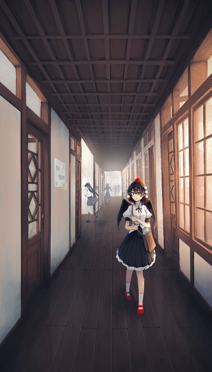 I glance over to Eternity and Kazami, I think discussing Wriggle’s absence, and wave Ran to bring me closer to her. She sets me down so that I might bend her ear, conspiring in hushed tones, “Do you know anything about doors in weird places?”