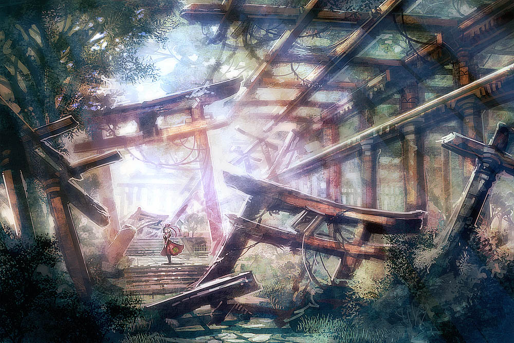 I'm not certain whether these trips are more or less jarring than being carried by a tengu in a hurry, but that uncertainty alone makes the difference meaningless. With my head still spinning from the “impact”, it's difficult to will myself off the ground, even as all the wrong stones hit all the wrong bones. Why, in some unfathomable way it's actually rather nostalgic, inviting me to lay for a moment longer. Come to think of it, nearly everything I've seen has had that hint of familiarity, barely a whisper in the breeze. I know I should press forward, but...maybe there's something worth investigating here, and just a moment's rest can make such a difference. Hopefully this wretched place will allow me that little. Under my eyelids rests a hovel's roof, a shoddy little thing by any animal's standard, hastily constructed of little more than twigs. The ground beneath me is rife with pests of a nature I'd rather not contemplate, but they pass over my arms, legs, and face without bothering to consider me. The pain from my makeshift bedding subsides beneath the pain in my bare feet (the cuts and scrapes weeping openly in place of my dried-out eyes) which subsides beneath that of my chest, a sharp yet constant ache beneath the bones, beneath the muscle. The rain does little to calm me. Nothing will bring it all back.